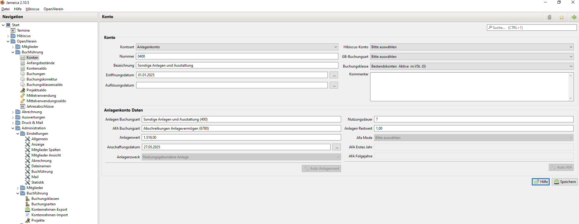Dazu das Konto 6780 "Abschreibungen Anlagevermögen". Dieses Konto ist aktiv, Art ist Ausgabe in der Buchungsklasse Sonst. Zweckbetrieb und das Häkchen bei Abschreibung ist gesetzt.