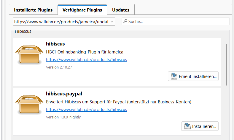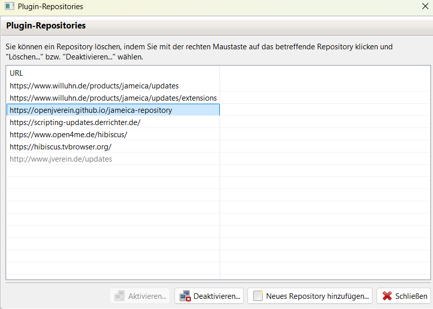 Es gelingt mir nicht JVerein zu installieren, und das auf zwei verschiedenen Rechnern (Win10 + Win11) nicht. Jameica ist erfolgreich installiert, ebenso das Hibiscus-Plugin. Aber das JVerein-Plugin taucht nicht auf, weder bei den installierten, noch bei den verfügbaren Plugins. Das Repository (https://openjverein.github.io/jameica-repository) ist aktiviert. Ich sehe aber keinen Weg, um darin das JVerein-Plugin auszuwählen und zu installieren, anklicken oder Doppenklick bringt nichts, einen entsprechenden Button finde ich nicht.