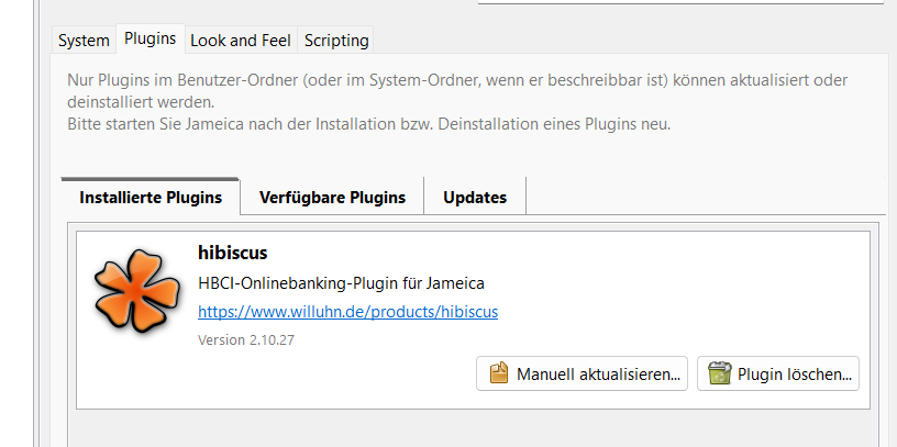 Das ist richtig, das Bild stammt von der alten Dokumentation. Aber das ändert ja nichts daran, dass ich das Plugin nicht sehe. In der Repository-Liste von Jameica stehen beide Plugins (vom alten JVerein als auch vom OpenJVerein). Da ich das Jverein-Plugin nicht löschen kann, habe ich es deaktiviert (einen Button zum Löschen gibt es nicht, siehe auf dem zweiten o.a. Screenshot).