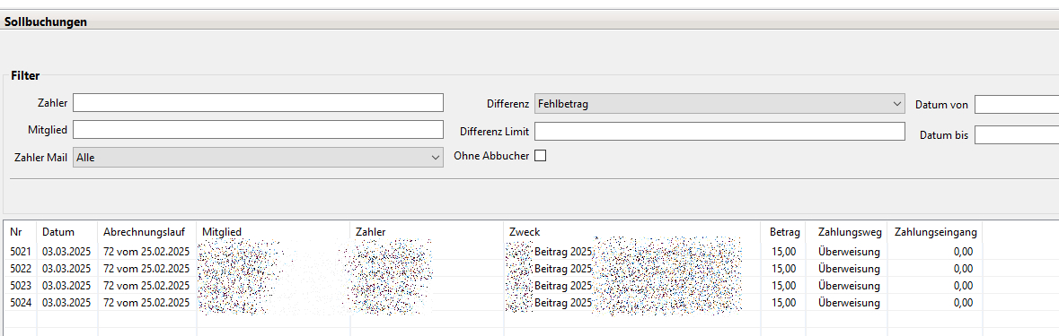 in der Version 3.1.3 Build-Date 20250725 sehe ich unter >> Sollbuchungen << das vier Mitgliedern einen Fehlbetrag haben. Wenn ich das jetzt richtig verstanden habe, muss ich doch unter >> Buchungen << rechts klick und dann >> Sollbuchungen zuordnen <<, um die Buchung ein er ...