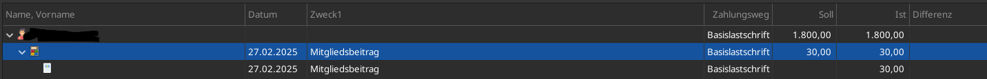 Normalerweise kommt die Lastschrift in einem einzelnen Betrag von der Bank (bei den meisten Banken). Diese wird keinem Mitglied zugeordnet, die zuordnung ist ja bei den im Abrechnungslauf erstellten IstBuchungen vorhanden, ebenso die Buchungsart.mase hat geschrieben: Mittwoch 26. Februar 2025, 09:29 Ja korrekt, die Abrechnungsläufe mache ich, ohne an Hibiscus zu übergeben. Es wird eine Sollbuchung und eine Istbuchung mit dem gleichen Betrag erstellt, es entsteht also keine Differenz. Wenn die Buchungen dann aus Hibiscus in die Jverein-Buchungsliste importiert werden, erhalten die Lastschriftbuchungen keine Beitragsart und werden auch keinen Mitglied zugeordnet. Die Überweisungen erhalten eine Beitragsart und werden auch einem Mitglied zugeorndet, wenn ich in der Buchungsliste auf Zuordnung klicke.